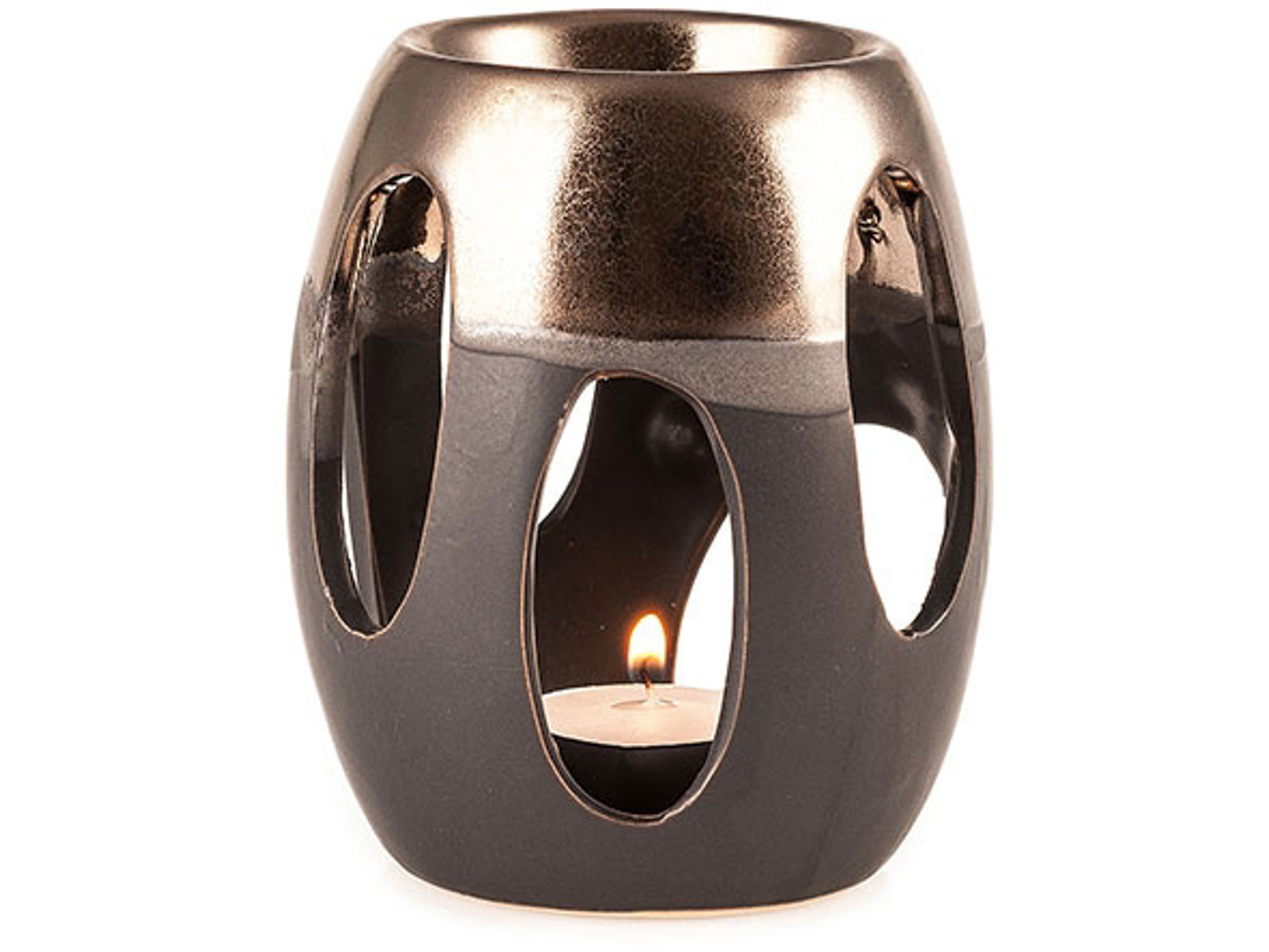 Duftlampe fremstillet af keramik. Brunglaseret med en top belagt med bronzefarve.