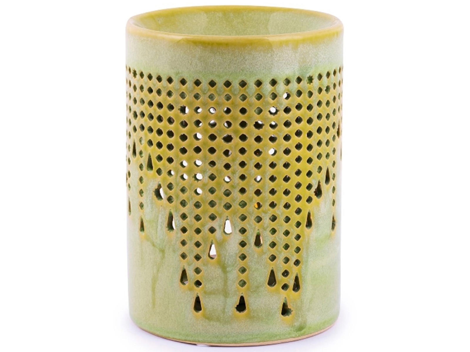 Duftlampe med fint hulmønster fremstillet i keramik med glasering i changerende grønne nuancer. Duftlampen er med fast skål.