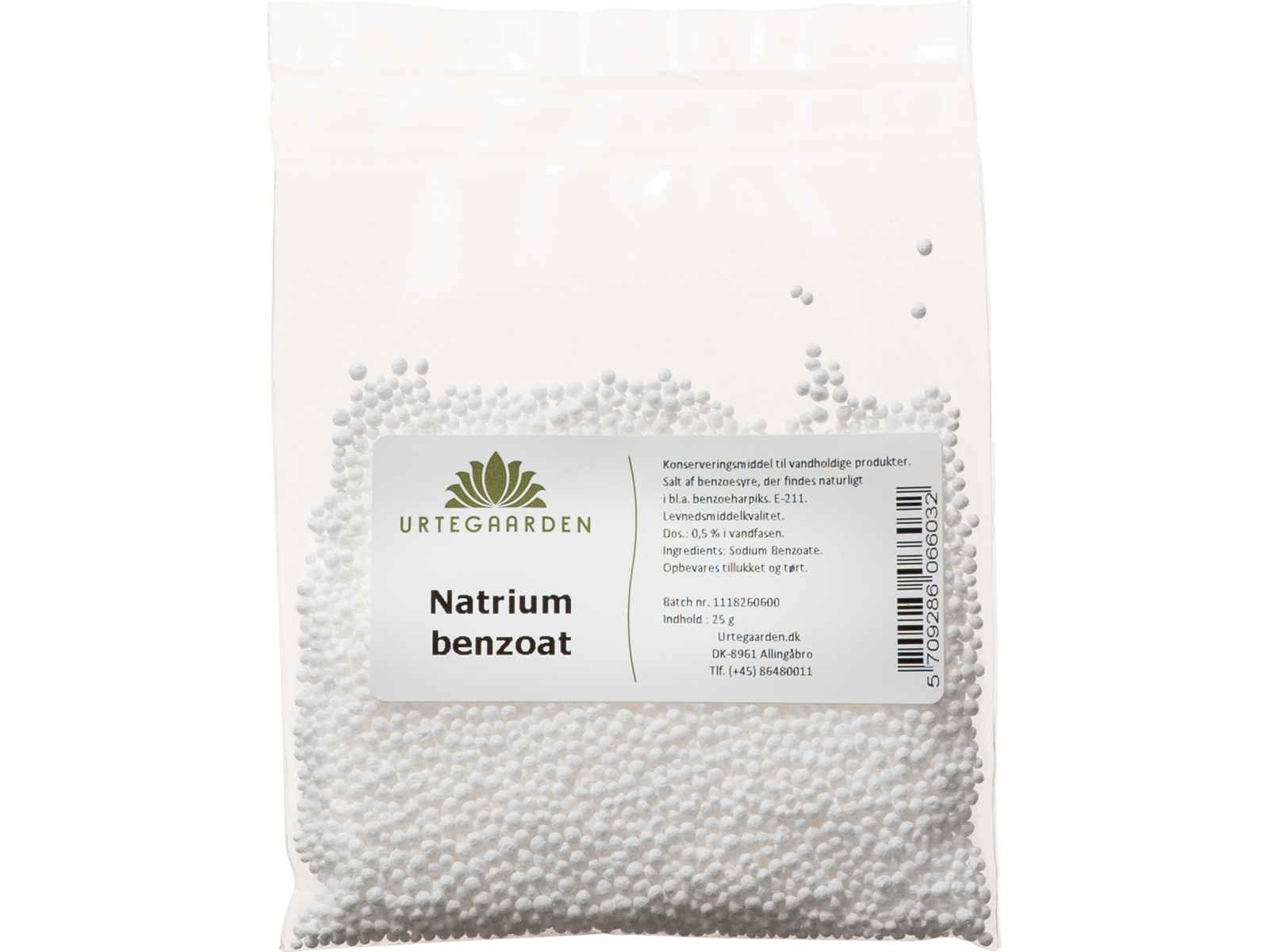 Kemisk ren natriumbenzoat (C7H5NaO2) fremstillet naturidentisk.