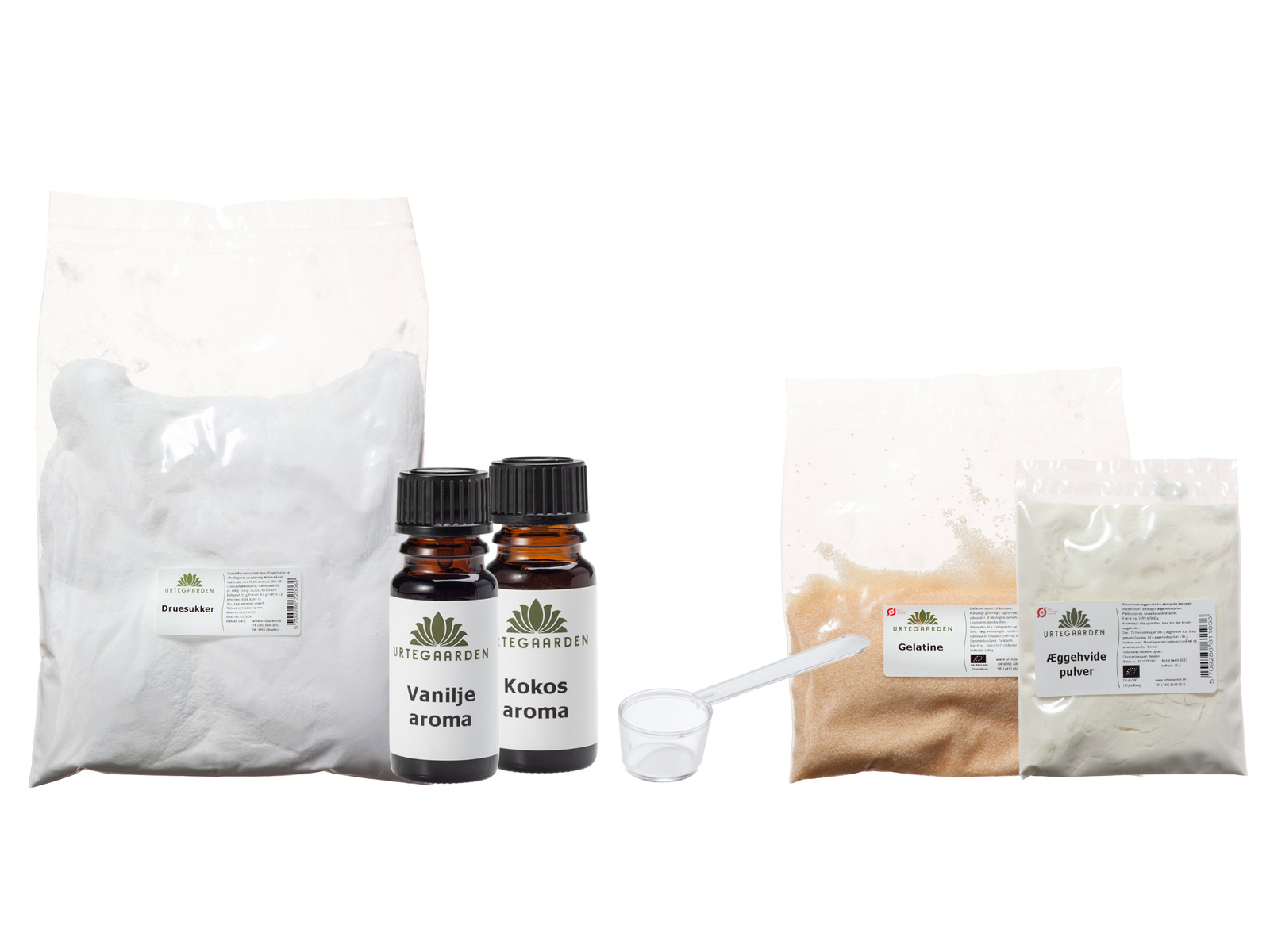 Kom nemt i gang med at lave lækre hjemmelavede skumfiduser med smag af vanilje og/eller kokos. Skumfidussættet indeholder råvarer (undtaget almindelig sukker) måleske samt udførlig opskrift til at lave 3 portioner vaniljeskumfidus a 250 g eller 3 portioner kokosskumfiduser a 250 g eller 2 portioner af den ene og 1 portion af den anden eller omvendt.