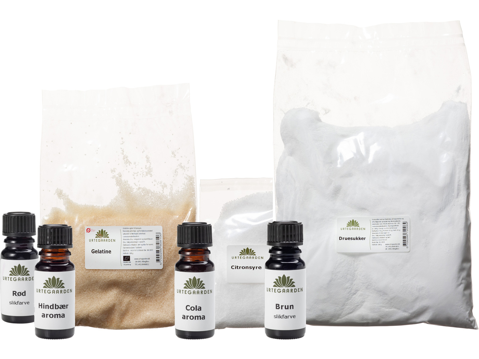 Kom nemt i gang med at lave lækker hjemmelavet vingummi med smag af hindbær og/eller cola. Vingummisættet indeholder råvarer (undtaget almindelig sukker) måleske samt udførlig opskrift til at lave 2 portioner røde hindbærvingummi a 500 g eller 2 portioner brune colavingummi a 500 g eller 500 g colavingummi og 500 g hindbærvingummi.