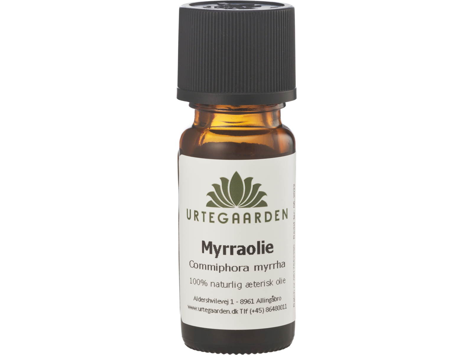 Myrraolie fra Urtegarden er en 100% naturlig og ren æterisk olie uden tilsætningsstoffer. NB! myrraolie er meget tyktflydende, det er ofte nemmest at bruge en lille spatel at tage den op fra flasken med.